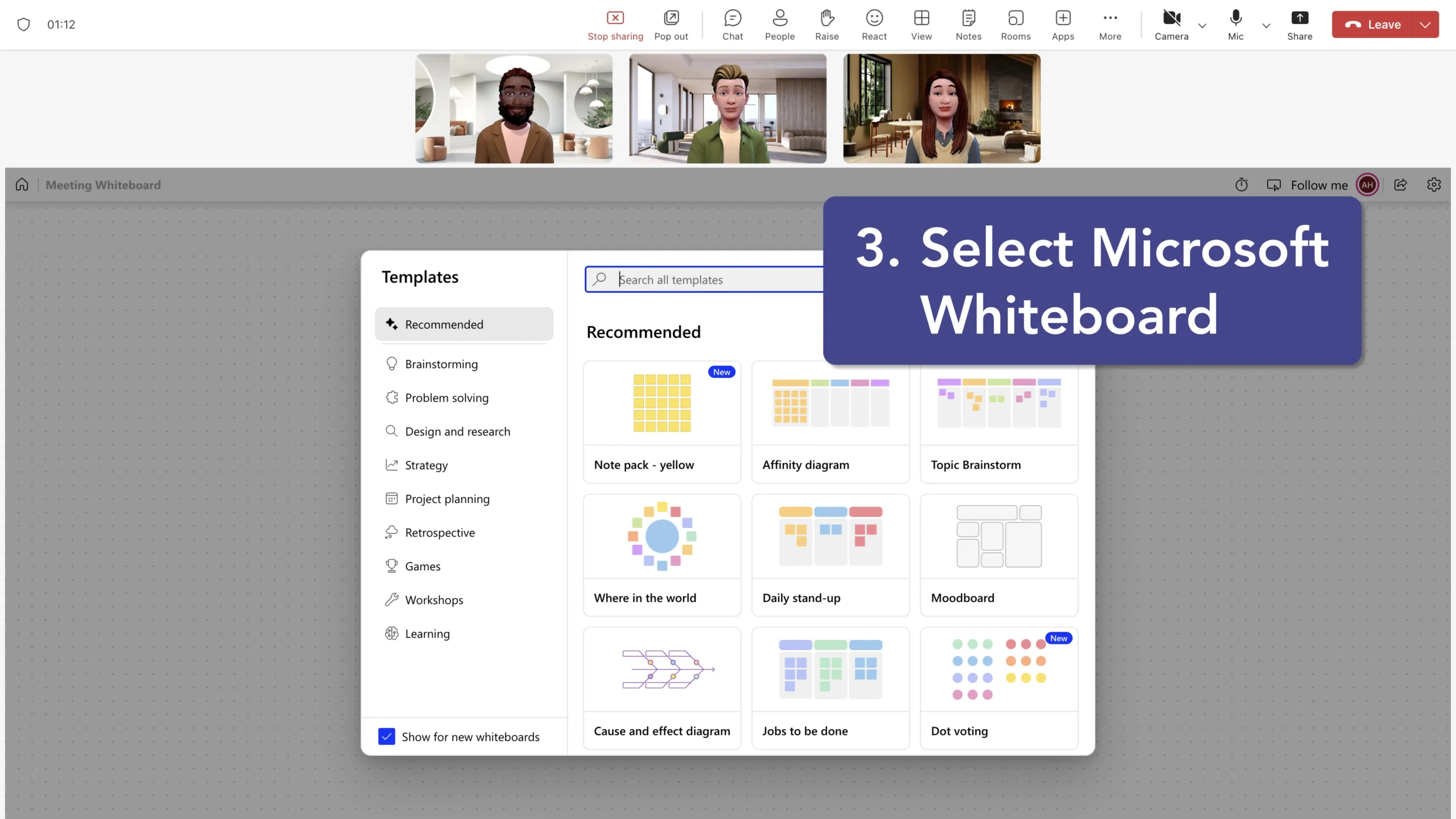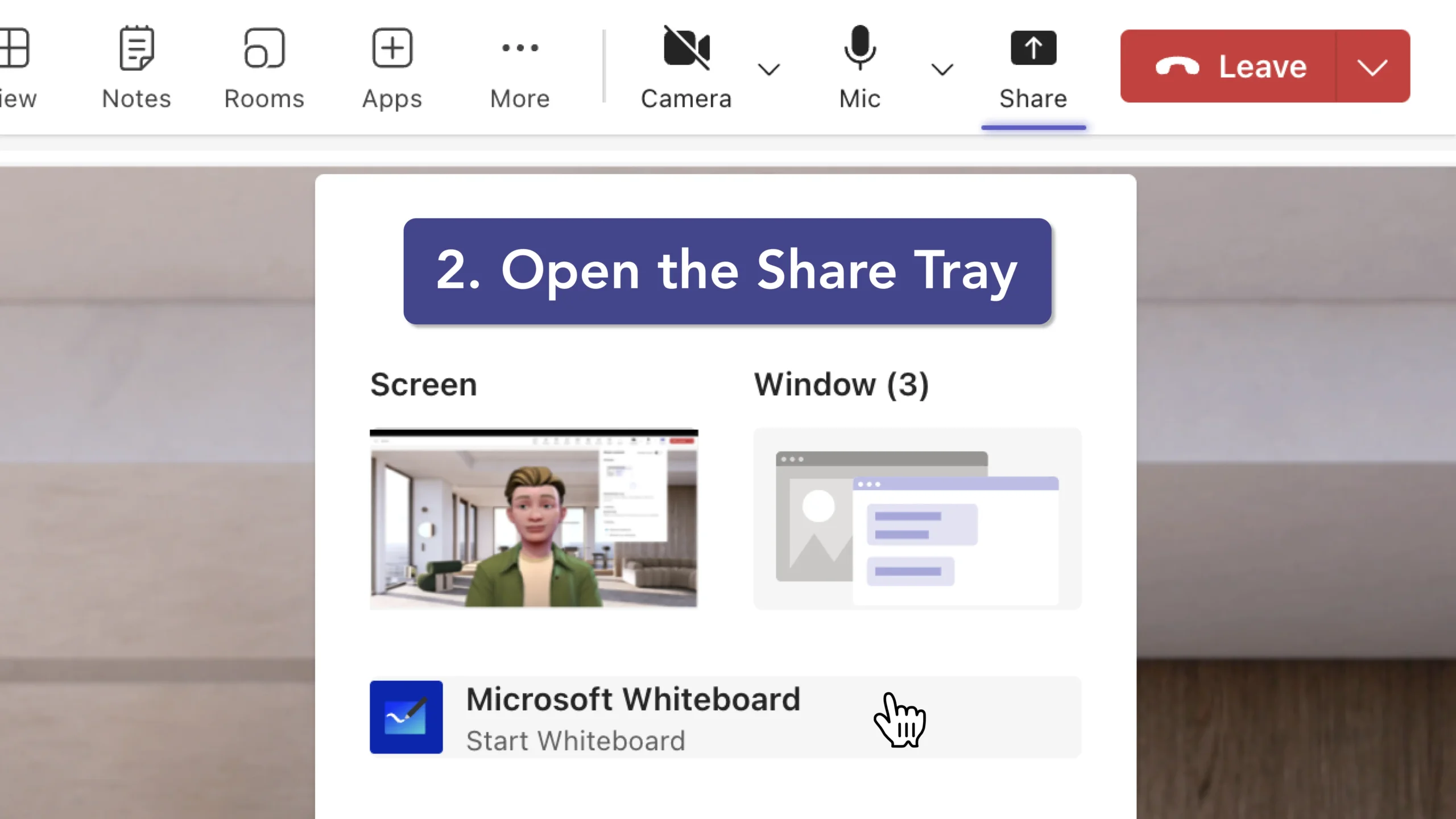 - Select Microsoft Whiteboard: In the Share Tray, you will see an option for "Microsoft Whiteboard." Click on this option to open the whiteboard.
