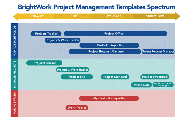 BrightWork ships with the templates depicted in the Project and Portfolio Management Spectrum diagram below. What defines the location of a template on the spectrum is the amount of ‘project management’ in the template; generally, this is determined by the number of lists in the template and the complexity of those lists.
