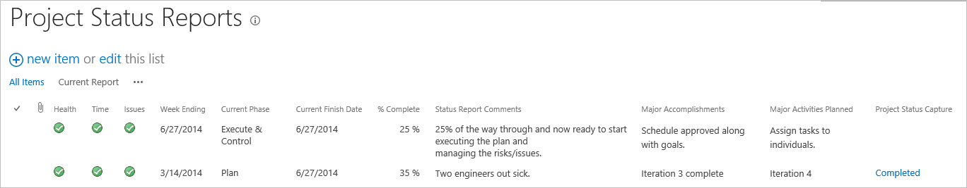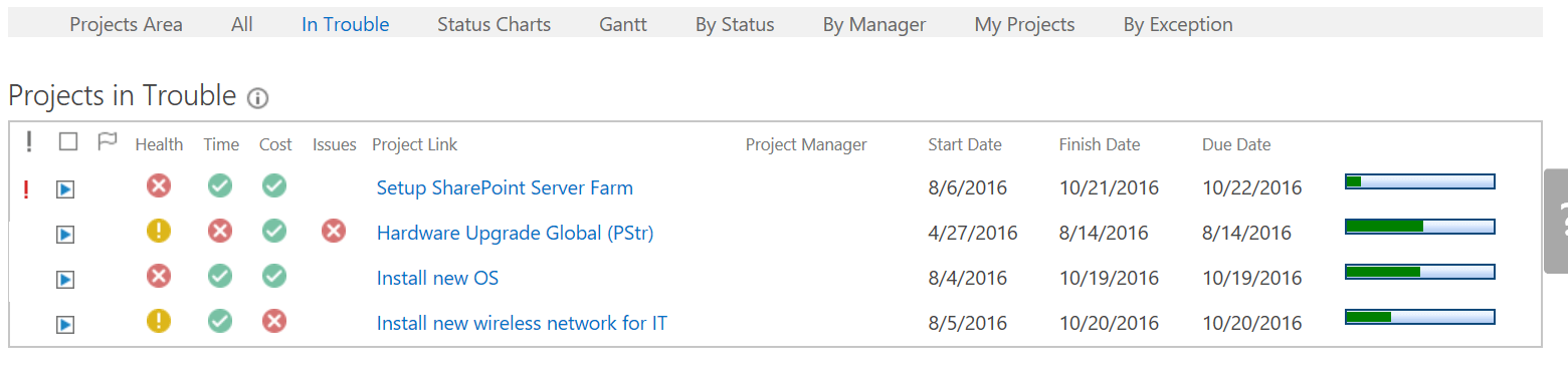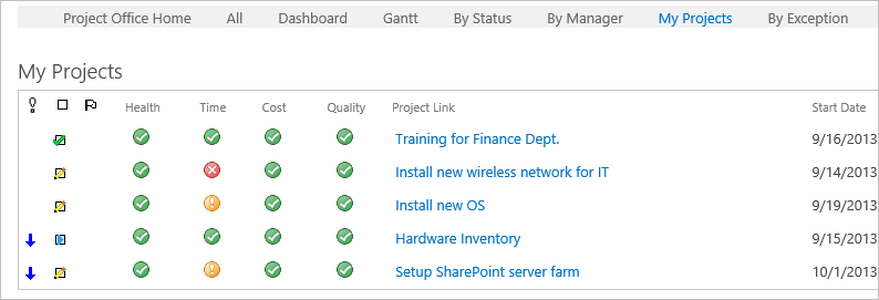 Looking at the Project Summaries report on the Project Office home page, it appears that overall, the general health of all projects is fine; however, some projects are late, and others are in danger of being late. If you wanted, you could drill down into the projects to find out what is causing these issues, or you could contact the various project managers directly and ask them what is going on.