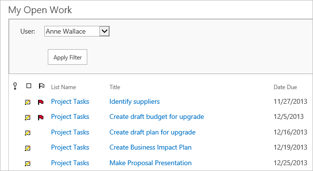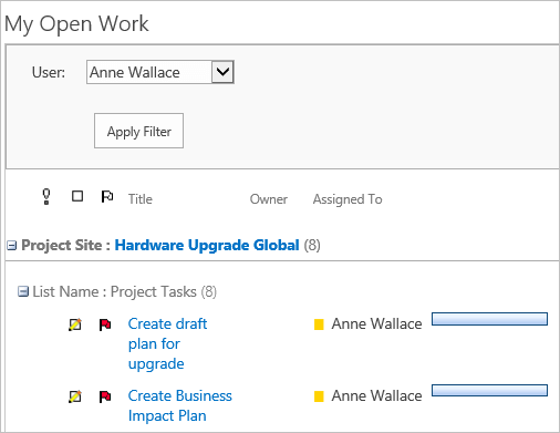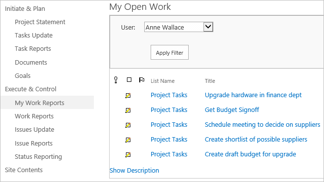 Click My Work Reports on the Quick Launch. You will see a report that details the items you assigned to yourself earlier. This is where Team Members go to find out what they have to do in the project. You can select other team member names from the drop-down menu to assess how they are getting on with their work.