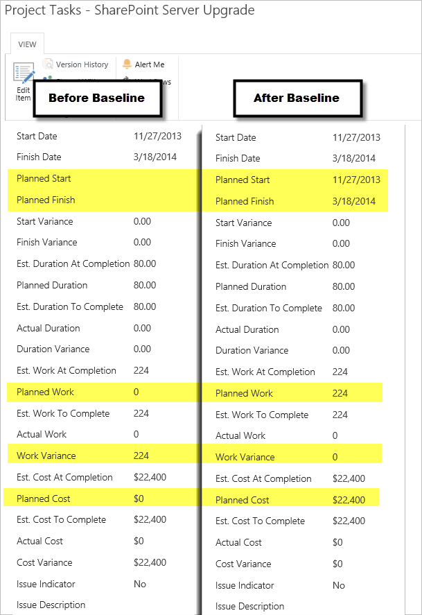 Note: See here for more information on indenting, out-denting, moving and deleting tasks. The important thing to realize about re-planning in SharePoint is that for changes that affect other items to be realized, you have to open the plan in Project and sync it, as SharePoint cannot do any recalculation – this can only be done in Project.