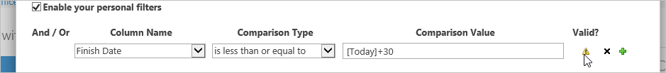 - While keeping the existing filter entries, click on the green plus sign to add an additional filter, and select Finish Date, and is less than or equal to, and enter [Today] +30.