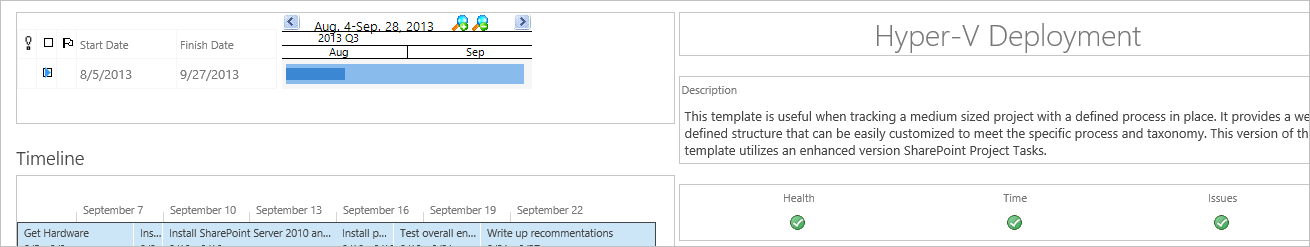 This template contains similar features to the Project Lite template, for instance, there is a Project Statement, Documents library and a Tasks list. For this exercise, find the Hyper-V Project you created during the Create a Training Project Office in the Introductory Guide.